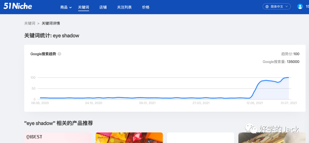 比如eye shadow这个词在Google搜索趋势中从6月份开始搜索趋势一直在上升,且搜索量还挺大,那可能眼影这个品类当前市场空间有很大增量空间,可以去尝试。