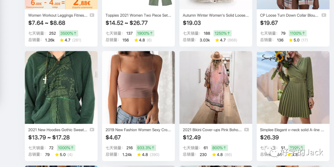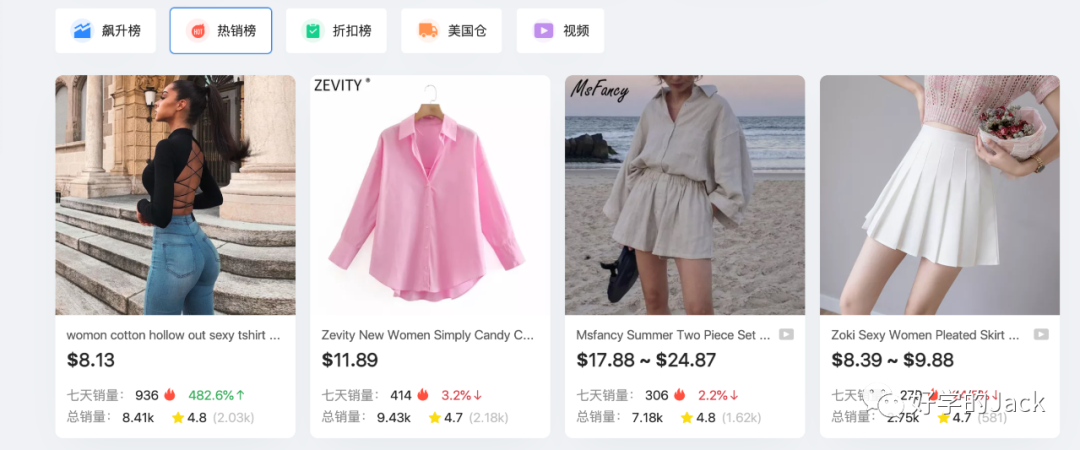 我们选择女装飙升榜,能看到一些近七天销量上涨非常多的商品,可以多浏览一下,找找哪些款有潜力成为爆款。