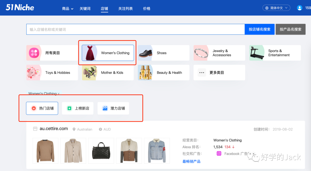 51niche提供了独立站店铺搜索功能,他能按照行业搜索,比如看女装下的独立站店铺有哪些,包括热门店铺、上榜新店和潜力店铺。