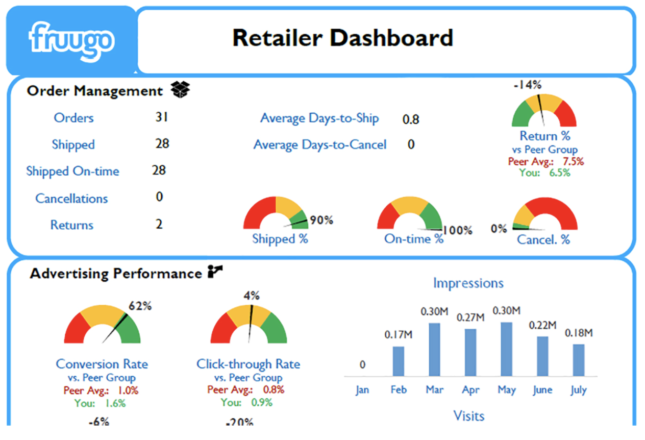 Fruugo电商平台近期推出了新的零售商仪表盘,可以让卖家更好的了解上个月的Fruugo绩效,涵盖了多个维度,该功能正在小规模的测试中,目前只面向小部分卖家开放。