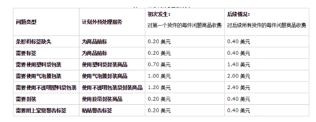 如果运送到亚马逊的商品没有经过妥善预处理或贴标,需要在亚马逊运营中心实施计划外预处理服务,例如贴标或塑料袋包装。目前,亚马逊物流对以下计划外预处理服务收取费用: