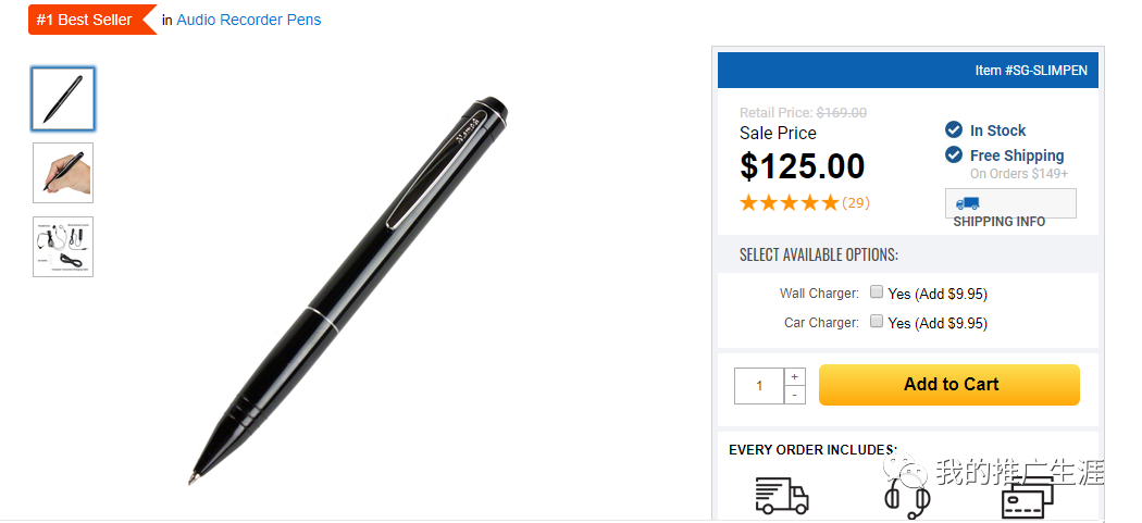 产品三:录音笔,网站售价125美元,速卖通上面售价20美元左右,我在速卖通看到这家店铺也是专门卖spy这类产品的,感觉不管产品的种类还是价格都比这个网站“美丽”太多了。