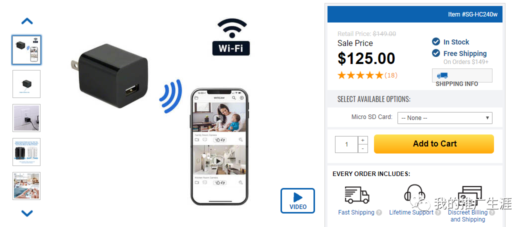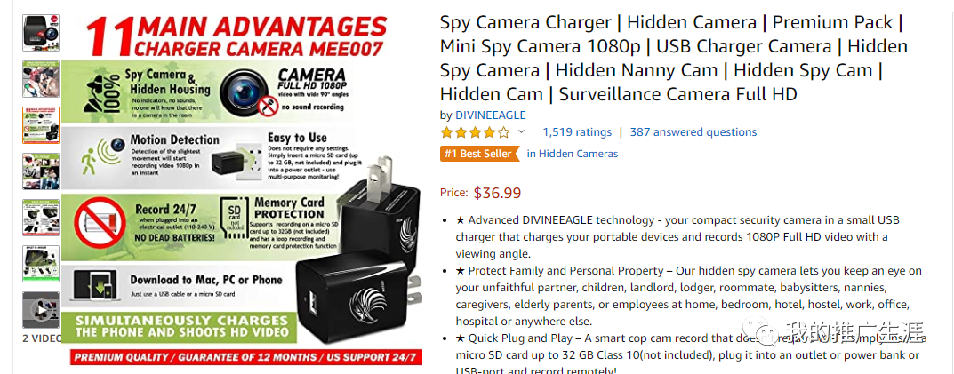 产品一:充电器偷拍,网站上面的售价是125美元,但是亚马逊的售价只有36.99美元,这中间就相差了88美元左右,这个利润实在有点高。