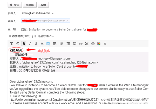 6、打开邮箱,找到刚才亚马逊发的那封邮件,把刚刚生成的代码回复给亚马逊