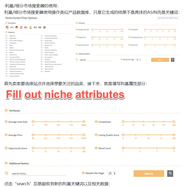 利基/细分市场搜索器:通过搜索关键词,分析相关关键词,以及排名前10每个关键词的产品销售数据;或选择品类,设置过滤器,要找有潜力的关键词,在市场和产品机会进行评估。
