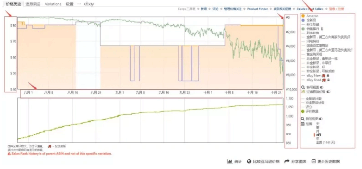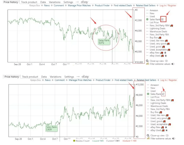 ·Sales Rank(销售排行榜):这个数据指标是重点关注的指标,它显示产品历史销售排名数据。纵坐标右侧的数据即代表排名,这个数据可以按照由低到高排列,也可以按照由高到低排列,只需要点击sales rank右侧的箭头图表即可切换。