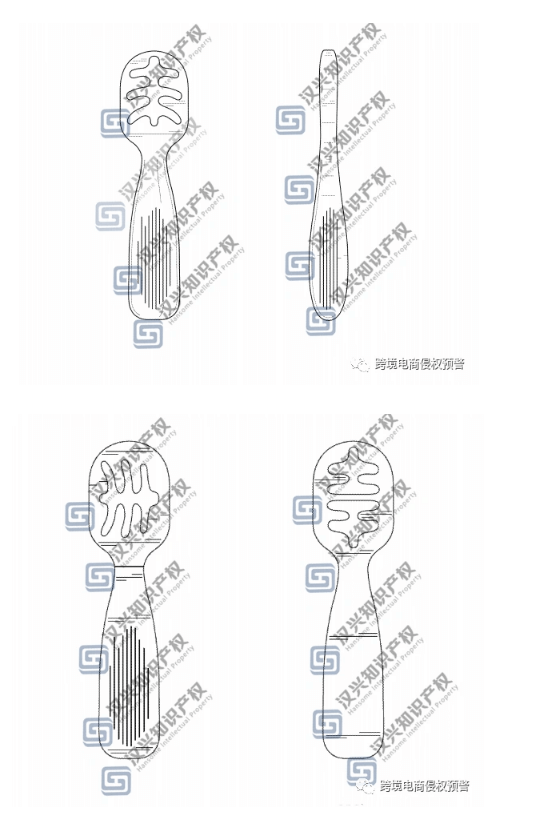 P.S.这款辅食勺主要设计要点为其勺子部分的镂空设计部分,因为镂空设计有多种形状,所以我们发现该专利有多款不同镂空形状的视图,这样做的好处是,可以比较全面的保护产品的不同款型,相当于做了一个产品的系列外观(值得学习,可以借鉴)。