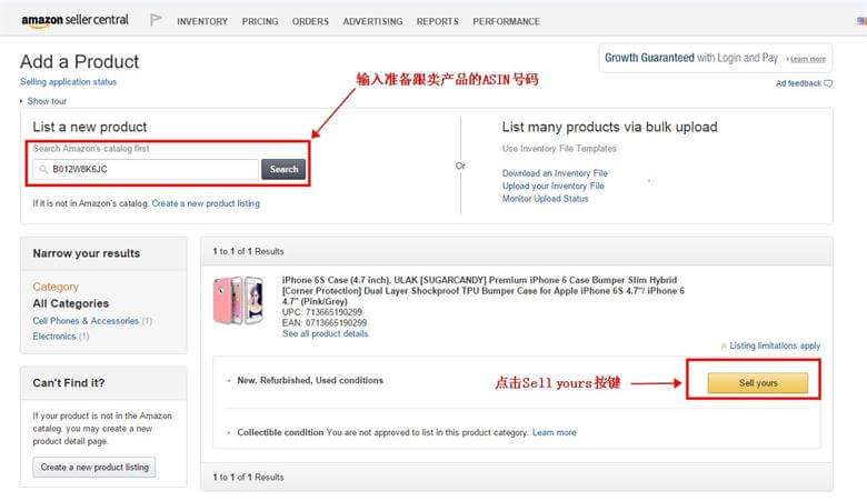 2、进入亚马逊后台,找到“Add a Product”按钮,在搜索框内,输入UPC码(ENA码、ASIN码或ASIN码)或产品标题,找到想跟卖的产品,再点击“Sell Yours”。需要注意的是,并不是所有产品都能跟卖。如果是能跟卖的产品的话,填写好产品状态、价格、数量就可以了。
