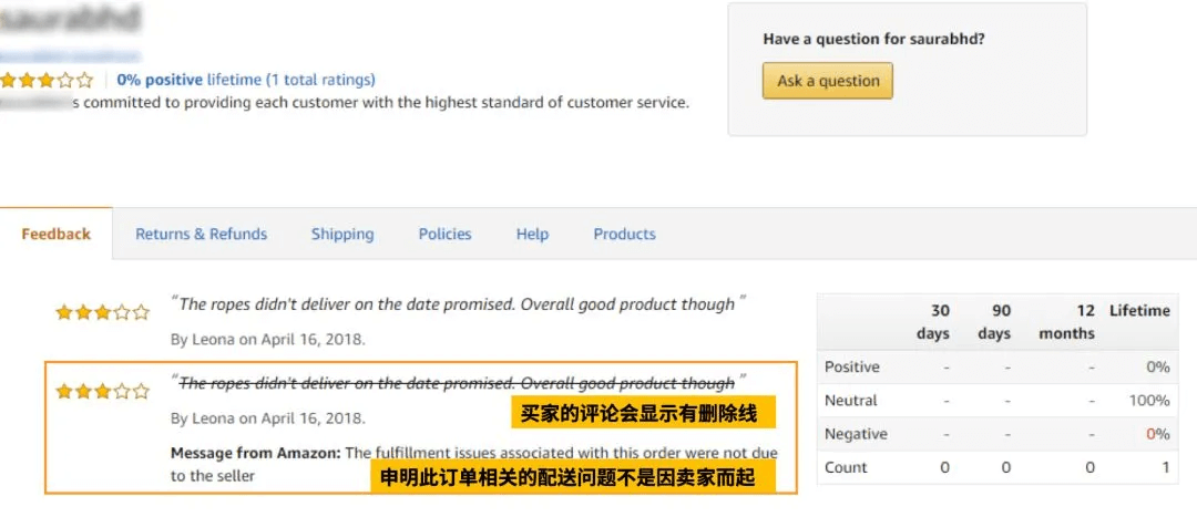 例如:卖家通过“购买配送”按时发货,也提供了追踪信息,但是买家给了差评,内容是关于包裹延迟或未送达问题,卖家可以请求对该反馈进行审核。如果亚马逊获批,这个差评不会影响订单缺陷率,而且买家的评论下,有一则声明:这笔订单相关的配送问题,不是卖家引起。