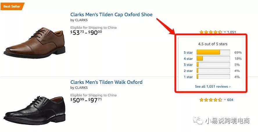 每个商品右侧都有星级显示,根据买家打分后综合权重得出的review。买家选择产品会看这个分数,所以很大程度上会受到影响,如果卖家想要客观获取一个漂亮的商品Review,也是一个值得思考的事情。