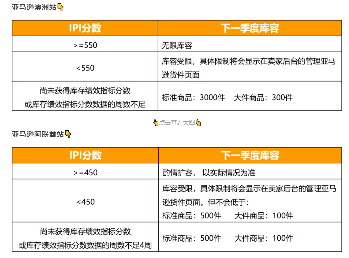 澳洲卖家和阿联酋站卖家需要注意:仓储限制每个季度或者或每三个月进行评估一次。下个季度起,会根据店铺库存绩效指标分数(IPI),调整库容。每个季度只有一个固定的库容量,一个季度不会改变。具体评估标准如下: