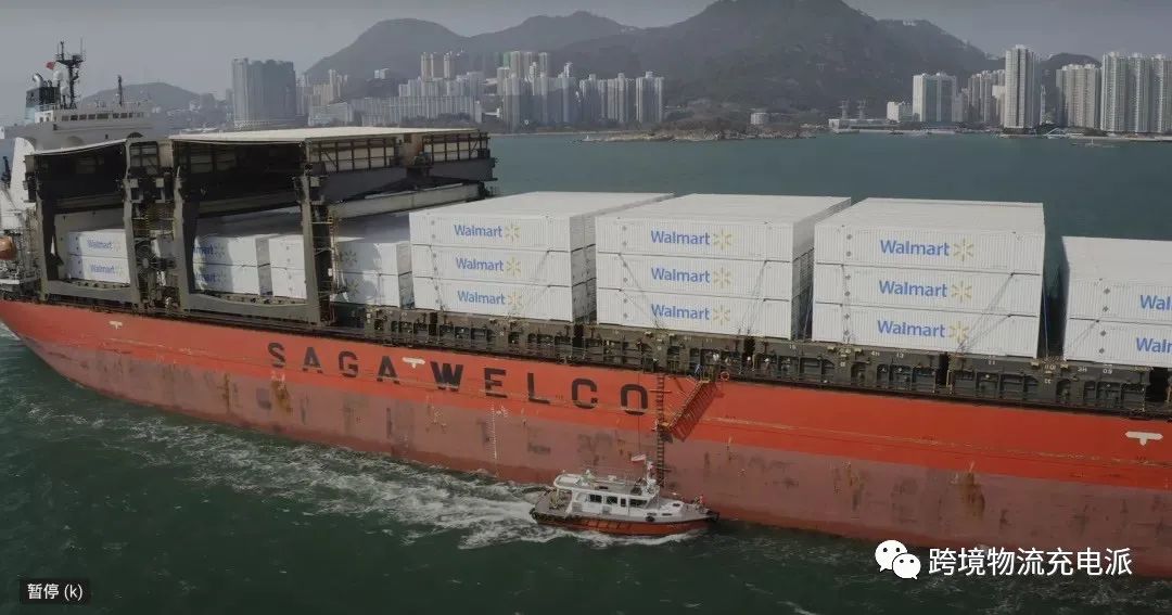 注:今年早些时候,沃尔玛国内集装箱装载在一艘普通货船的甲板上。