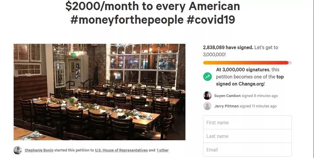 据悉,目前为止已有超过280万人在Change.org上签署请愿书,呼吁国会议员通过立法,一旦通过,政府将每月定期向民众支付 2000 美元。将很大缓解疫情打击下美国民众的经济压力,带来新一波消费需求。