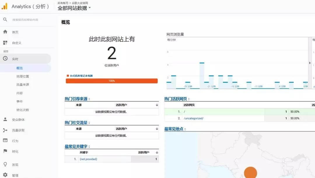 提供有关网站上当前网站访问者的有用信息,实时获得报告。并查看网站上的确切活跃用户数,每分钟和每秒查看的网站页数,活跃用户使用的热门关键字、顶级列表、活动页面、每个页面的活动用户数。