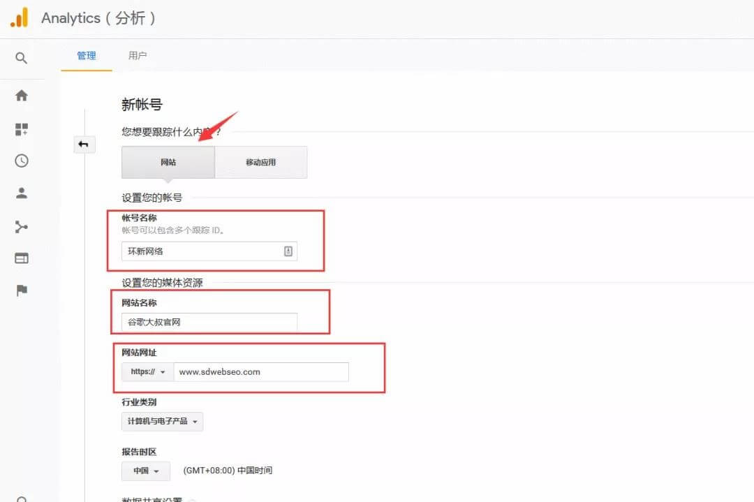 3.在谷歌分析的管理页面,创建账号,选择网站,填写网站的基本信息,然后点击左下角获取跟踪ID!
