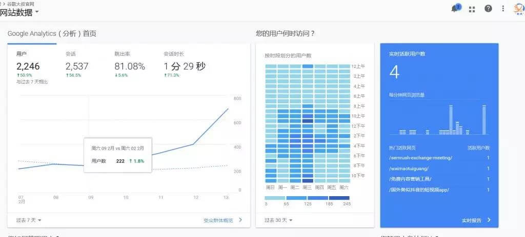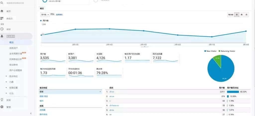 1、网站默认最近7天的数据(日期范围可以调整),包括:用户数、会话数、跳出率、停留时间等数据。