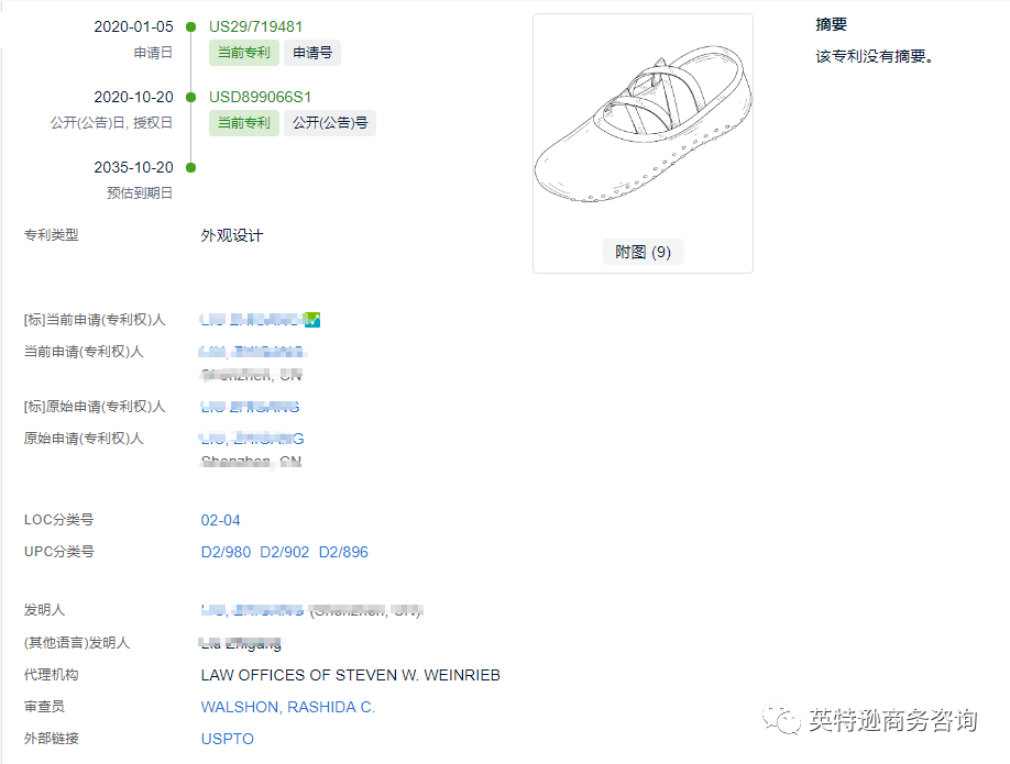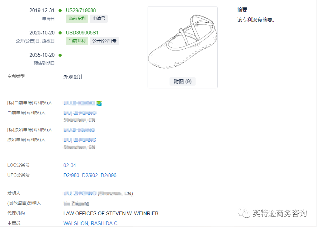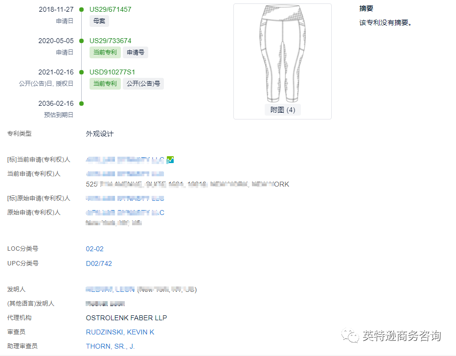 从截图可以看出以上产品都是有对应的在先美国外观专利。而且申请日期都是近两年注册的。其中两款瑜伽袜都是同一个中国人做的,由此可以看出,大部分的卖家还是有比较有前瞻性,会主动的为自己的产品穿上一层“防弹衣”,既保护了自己的发明创造成果,同时也提高了自己在市场中占有的优势。