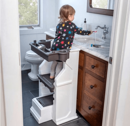 这款儿童学习塔(Learning Towers)可以当作幼儿学习塔、幼儿脚踏椅。在上部带有一个灰色托盘,托盘上还有杯架,但是问题就出在托盘上,CPSC认为托盘和台阶有可能出现松动,如果托盘出现脱落的情况,那么儿童也会因为跌倒产生危险。
