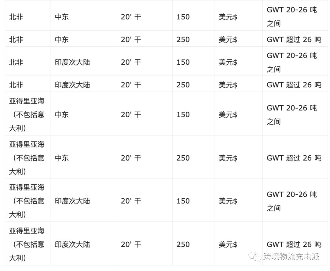 附加费也将于 10 月 1 日生效,毛重超过 22 吨且低于 28 吨的每 20 英尺干货箱的附加费为 600 美元,以及等于或高于 28 吨毛重的每 20 英尺干货箱附加费 1,000 美元。