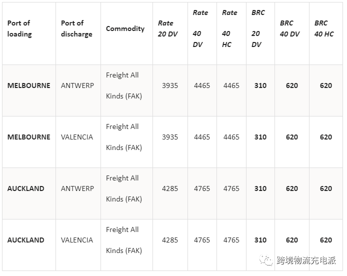 此外,主要航运公司将对从澳大利亚和新西兰到欧洲港口安特卫普和瓦伦西亚的所有 20 英尺、40 英尺标准箱和高箱箱实施以下各种货运 (FAK) 费率上调。