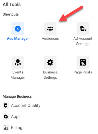1. 在您的 Facebook 广告仪表板中,单击所有工具并选择受众