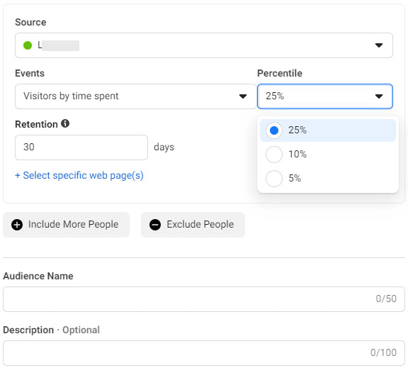 按百分比选择花费的时间,并为您商店中的每个访客创建一个受众。并且您始终可以选择特定的网页以按花费的时间创建自定义受众。
