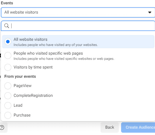 3. 从您的事件中自定义受众- 此选项允许您直接从您的像素事件中创建自定义受众。查看内容、添加到购物车、发起结帐和购买都是您可以从中创建自定义受众的事件。