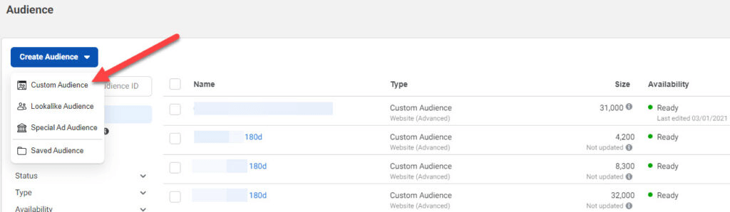 首先,您需要建立所需的目标受众群体。如果您在商店中安装了 Facebook Pixel 像素代码,那么创建受众群体就是小菜一碟。