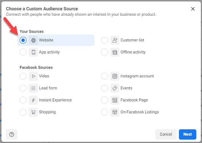 3. 在自定义受众来源窗口中,选择您的受众来源