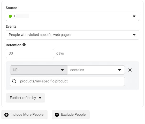 如果您的产品 URL 是 www.store.com/products/my-specific-product,那么输入“products/my-specific-product”或仅输入“my-specific-product”将使 Facebook 只收集用户谁访问了该特定产品页面。