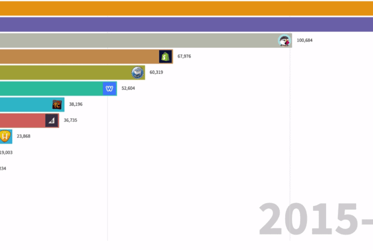 从2011年到疫情爆发期间,利用从BuiltWith收集到的数据,绘制了这十年最常用平台的兴衰图。