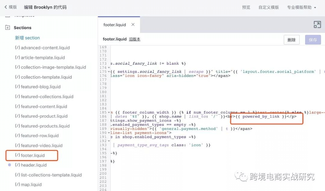 然后,在模板目录里面的 Sections文件夹里,找到 footer.liquid 文件,更改 {{ power_by_link }} 这里的代码就可以了,比如改: shopify119.com ,然后保存即可。