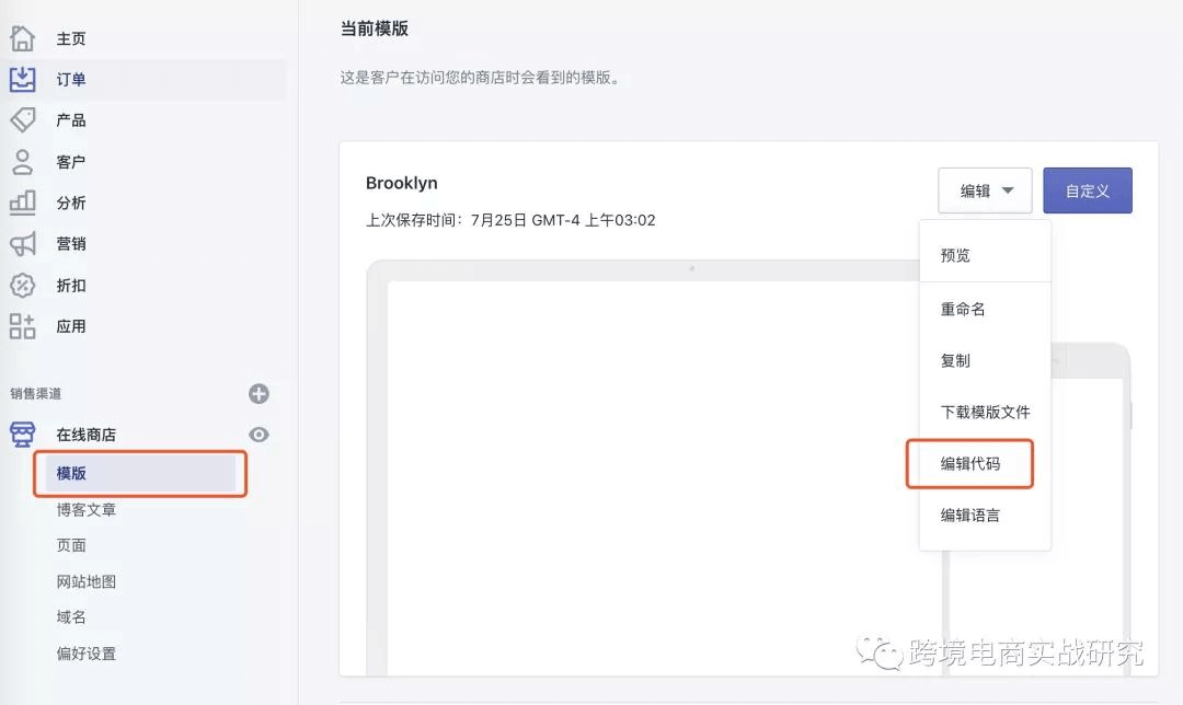 进入shopify后台,找到 在线商店 -》模板 -》 编辑代码