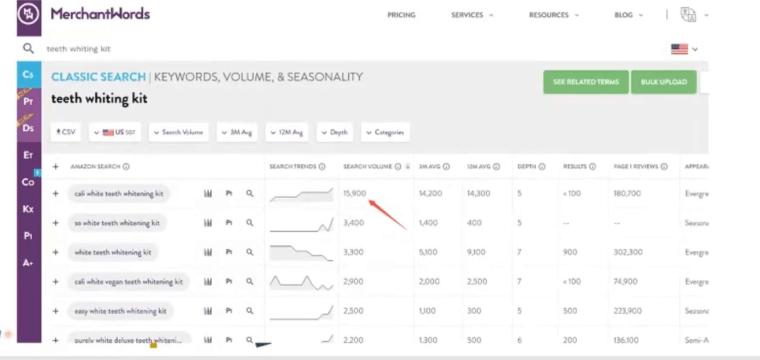 用户高需求,产品搜索量大。如果你不是亚马逊品牌备案卖家,你可以利用merchantword第三方工具查看主要关键词,主要长尾词普遍搜索量主词至少要有20万以上,最好是百万级别。如果搜索量比较高的产品,长尾词和搜索量不低的情况下,意味着产品销量一般,也不会很低。