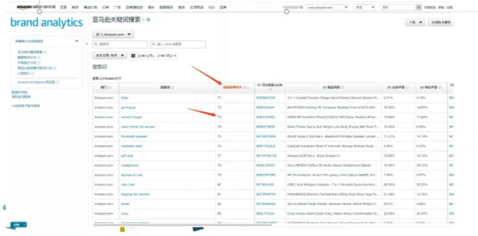 用户高需求,产品搜索热度高。如果你是亚马逊品牌备案的卖家,那么后台就会出现brand analytics,可以利用这一插件查看产品的热度,“搜索频率排名”的数字越小,产品热度越高,意味着成功几率越高。