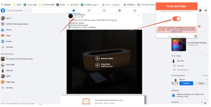 许多卖家会在Facebook上投放广告,我们可以通过Facebook安装插件Turbo Ad Finder发掘产品。