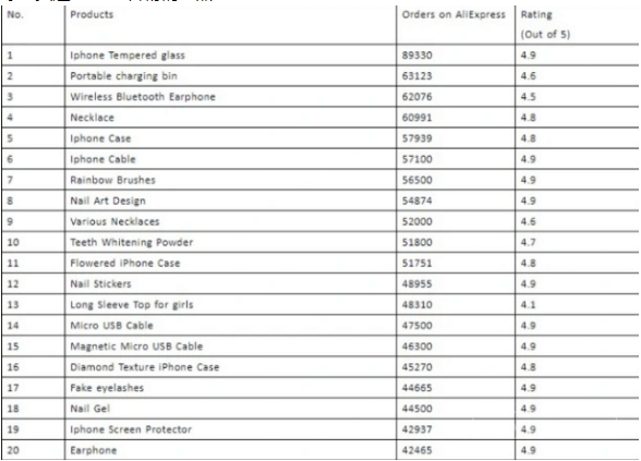 iPhone钢化玻璃成为速卖通最受欢迎的商品,目前已售出超过89000台。以下是全球速卖通的前20名畅销商品: