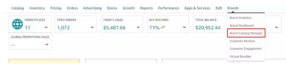 品牌注册卖家可以在顶部导航的“品牌”选项卡中找到品牌目录管理器。
