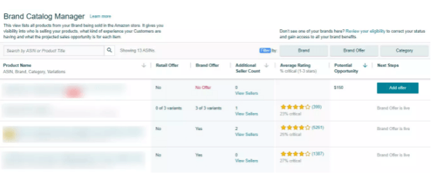 亚马逊针对品牌注册的卖家更好的管理目录,特地推出目录管理新工具,可以让卖家更好的管理品牌经销商,产品的平均评价分数以及预测未来一年的销售额。