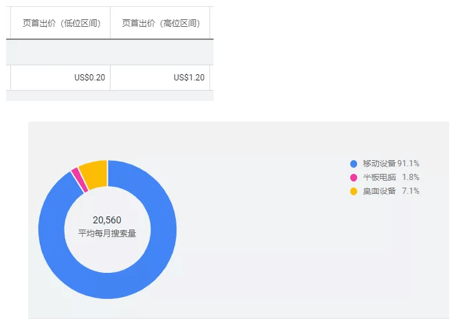 例如,gold dog chain,可以利用关键词规划师看到页首低位区间(首页的最下方文字广告位置)出价在0.2美元,高位区间(首页最上方的文字广告位置)出价是1.2美元,如果利润可以的话,前期建议直接出价1.2美元,跑个几天,cpc就会降下来的。