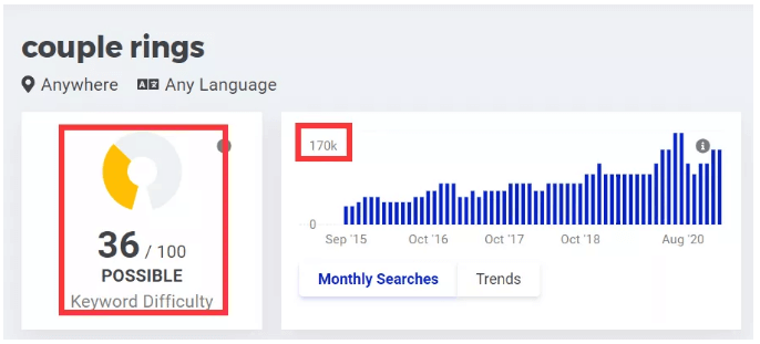 例如,couple rings,你可以用kwfinder,ubersuggest,semrush等工具来查询搜索量和难度。一般用kwfinder查询,搜索量大于1万(月均搜索量),seo难度低于35度是可以重点考虑的。