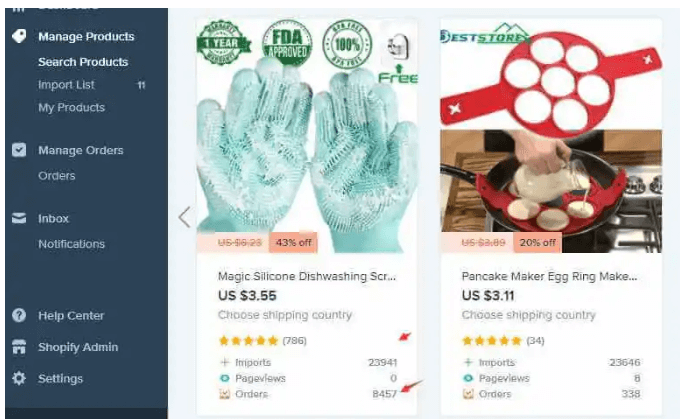 4,oberlo:你只需要在shopify app中心安装这个应用即可,进入oberlo后台,点击左侧的“Search Products”,你可以看到展示出来的产品,有多少店铺通过oberlo导入了这个产品,这个产品的出了多少单都是可以看到的,这对于我们选择一些热门的产品非常的方便。