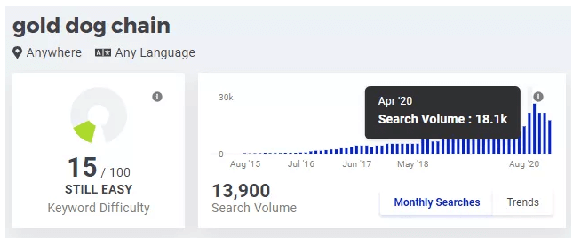 像之前我推荐过的gold dog chain,今年的搜索量暴增,但是seo难度显示还是比较容易。