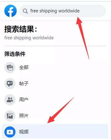 5,facebook:输入关键词,例如:free shipping worldwide,50% off,only today,giveaway等等,然后选择视频,我们看到很多的广告视频。