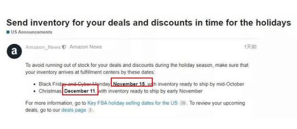 黑五和网一库存应在2021年11月15日之前送达亚马逊的配送中心。