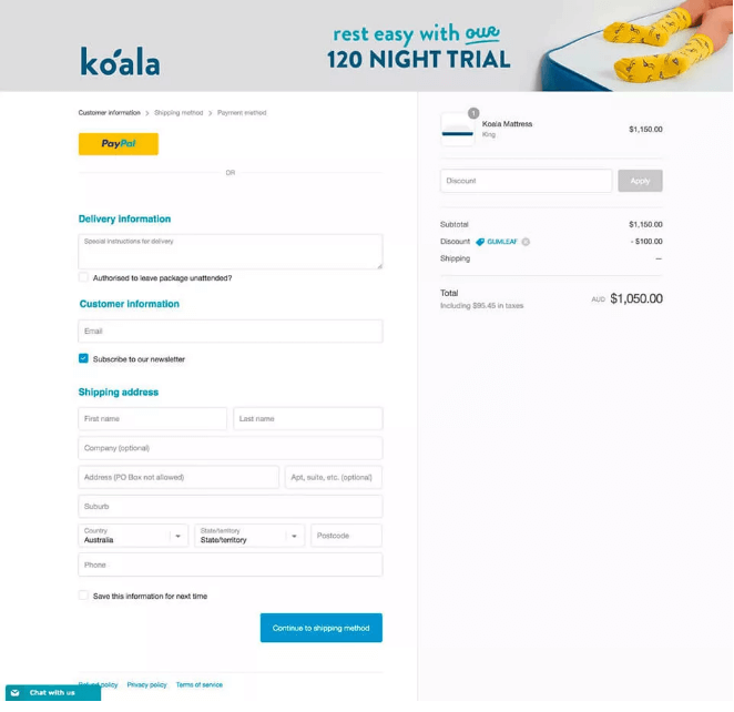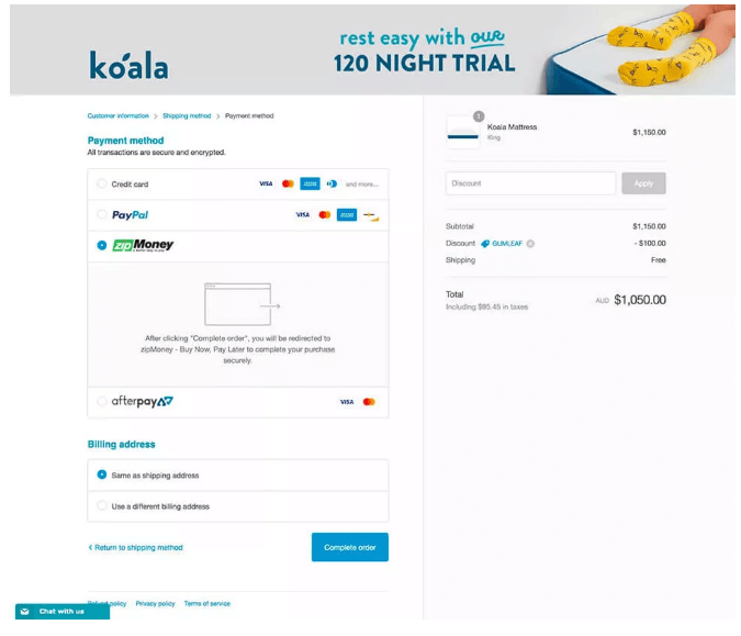 Koala网站中的结账流程是这样的: