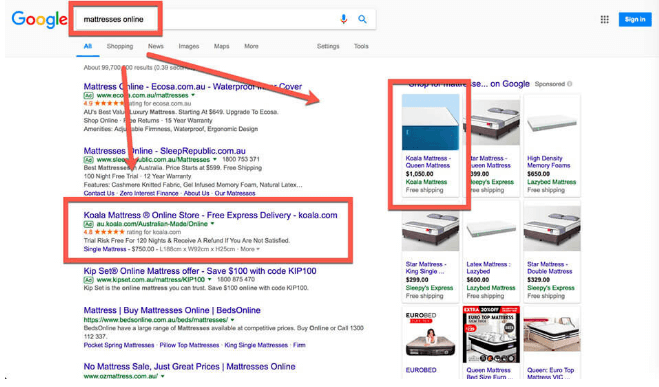 Koala在Google上为其产品投放了搜索广告和产品详情广告,以下是Koala投放的关键字为“在线床垫”的广告示例: