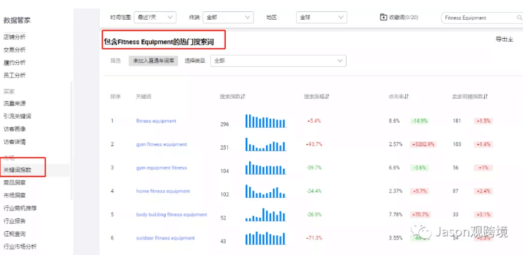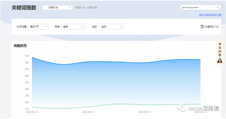 假如我想做健身器材,那么用Fitness Equipment这个词来搜索,可以看到健身器材相关的行业了,像瑜伽垫,跳绳,哑铃等,也可以看到近期的搜索热度是否上升,可以根据这个,来定制你的产品线,丰富你的产品。