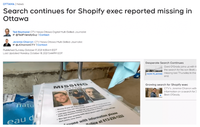 然而更让人值得关注的是,该企业的财务总监已经失踪了5天!如果你现在行走在Ottawa(shopify总部所在地)的任何一个角落,都会看到如下图所示的寻人启事。不要感觉惊奇,这是真的!现在警方和所有媒体、全民,正大范围的搜寻着他的踪迹!各大海报都是他的人像,街边贴着。