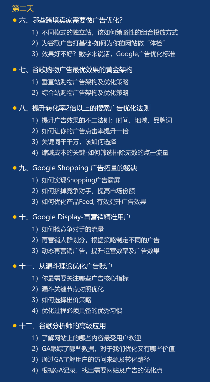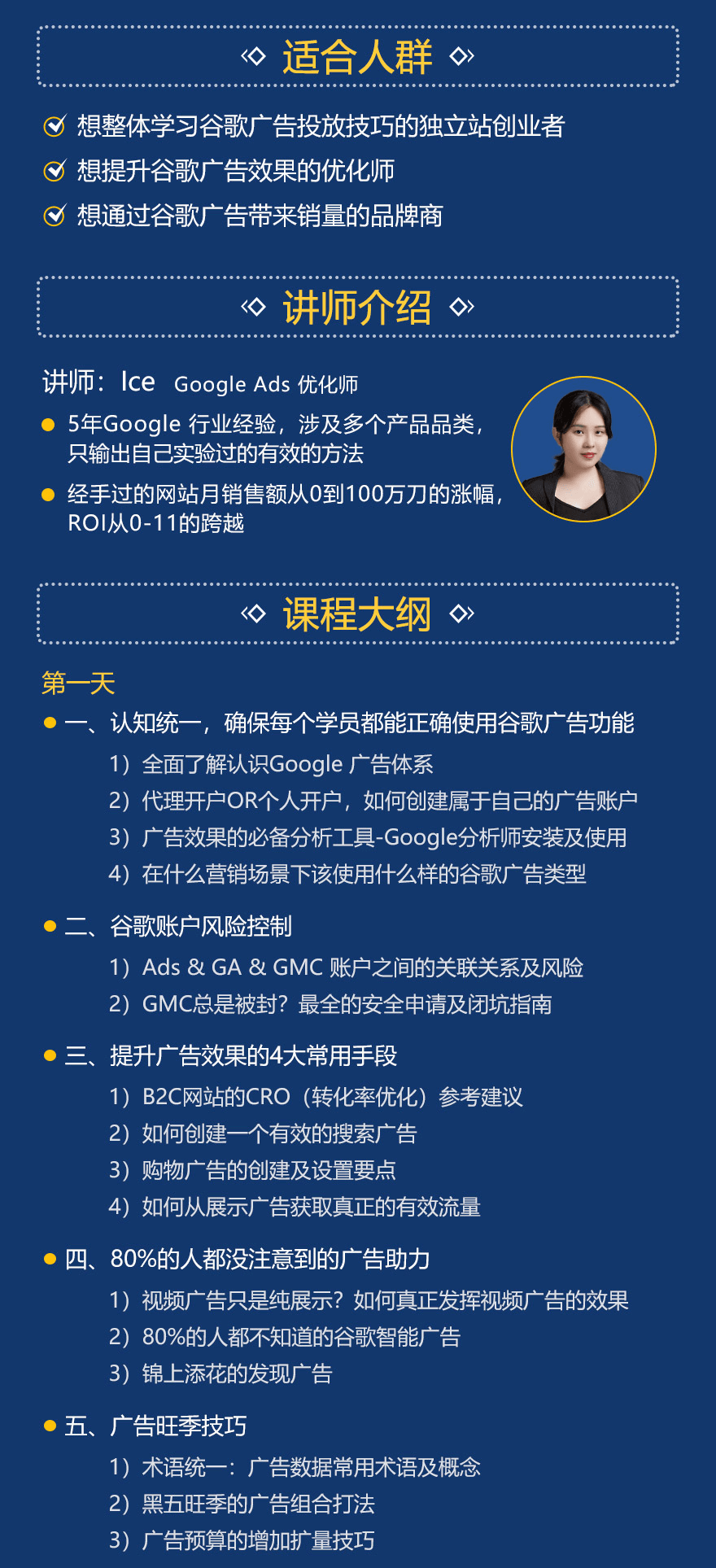 谷歌广告从进阶到高阶课程,实战派谷歌广告负责人系统讲解旺季广告的打法,如何根据自己的品类,最大化利用不同类型的谷歌广告,从网站、CRO、数据,使用技巧等维度放大广告效果,提升整体ROI。